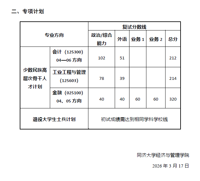 同济大学经济与管理学院 2026 年专业学位硕士研究生进入复试的初试成绩基本要求