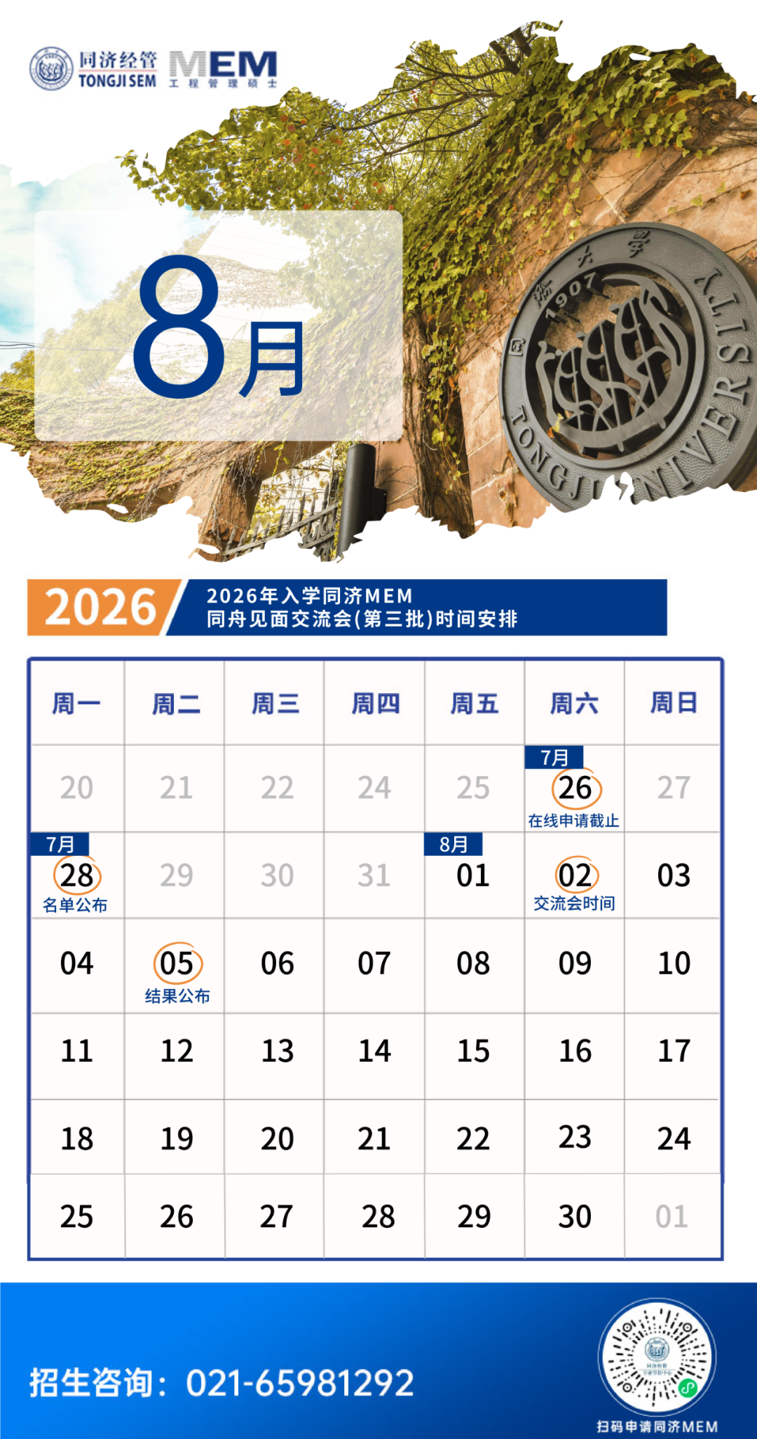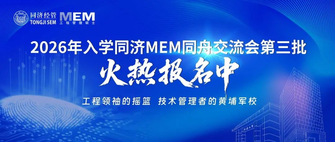 为帮助有意向报考MEM的考生深入了解同济大学及其经济与管理学院的工程管理硕士(MEM)项目,搭建考生与专家教授之间的沟通平台,同济大学MEM中心面向非全日制MEM项目特别举办“同济大学2026年入学工程管理硕士(MEM)同舟交流会”。
